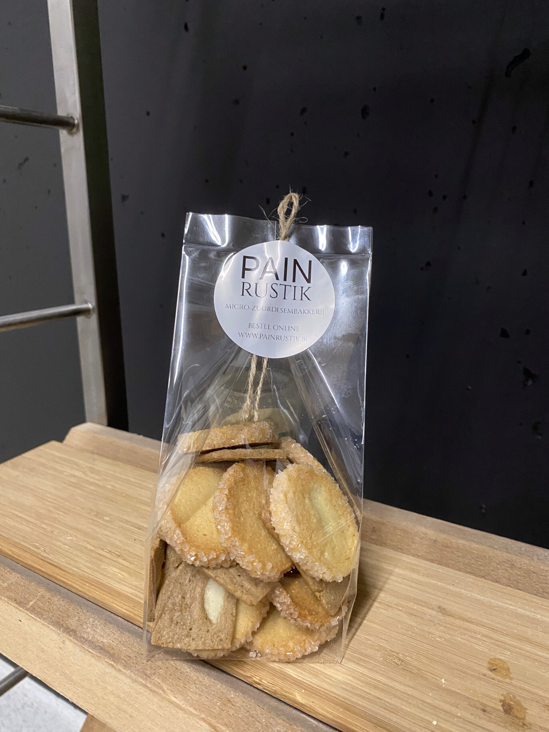Tarwebloem, boter, ei, suiker, kandijsuiker, vanille, kaneel, amandelen